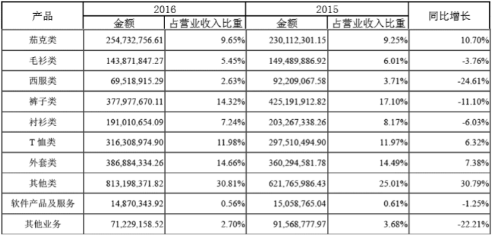 七匹狼營(yíng)收增長(zhǎng)疲乏、盈利能力下滑,與產(chǎn)品銷(xiāo)售情況密不可分。2016年七匹狼線上渠道營(yíng)收約9億,這里面針紡類產(chǎn)品就約4億。也就是說(shuō)七匹狼線上渠道,近一半靠的是內(nèi)衣、內(nèi)褲、襪子等低利潤(rùn)產(chǎn)品。從分產(chǎn)品營(yíng)收來(lái)看(如圖):