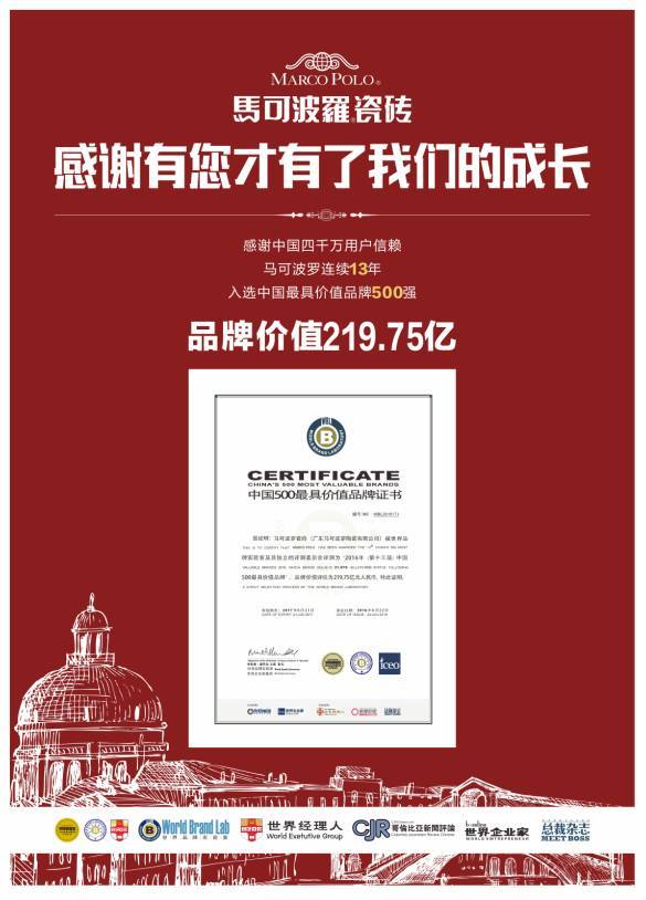 在被業(yè)內(nèi)譽(yù)為房地產(chǎn)及產(chǎn)業(yè)鏈領(lǐng)域的“奧斯卡”盛典的,中國(guó)房地產(chǎn)開(kāi)發(fā)企業(yè)500強(qiáng)首選品牌測(cè)評(píng)中,馬可波羅瓷磚連續(xù)三年榮獲建筑陶瓷品牌開(kāi)發(fā)商排名第一的殊榮!