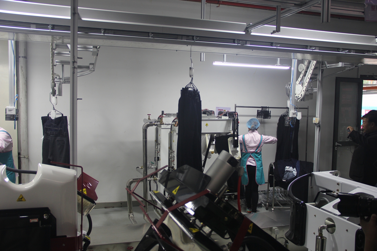 記者在康潔洗衣西安中央洗衣工廠內(nèi)看到,由淺色衣服干洗機、毛呢外套干洗機、西服專洗機、羽絨服專洗機、褲子專洗機洗滌設(shè)備和機器人熨燙機、自動化分揀傳送系統(tǒng)組成的洗衣流水線正在工作人員的操控下有序工作,比較傳統(tǒng)洗衣門店更讓人放心。