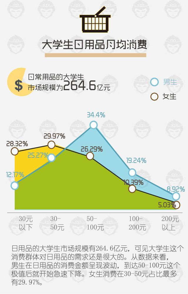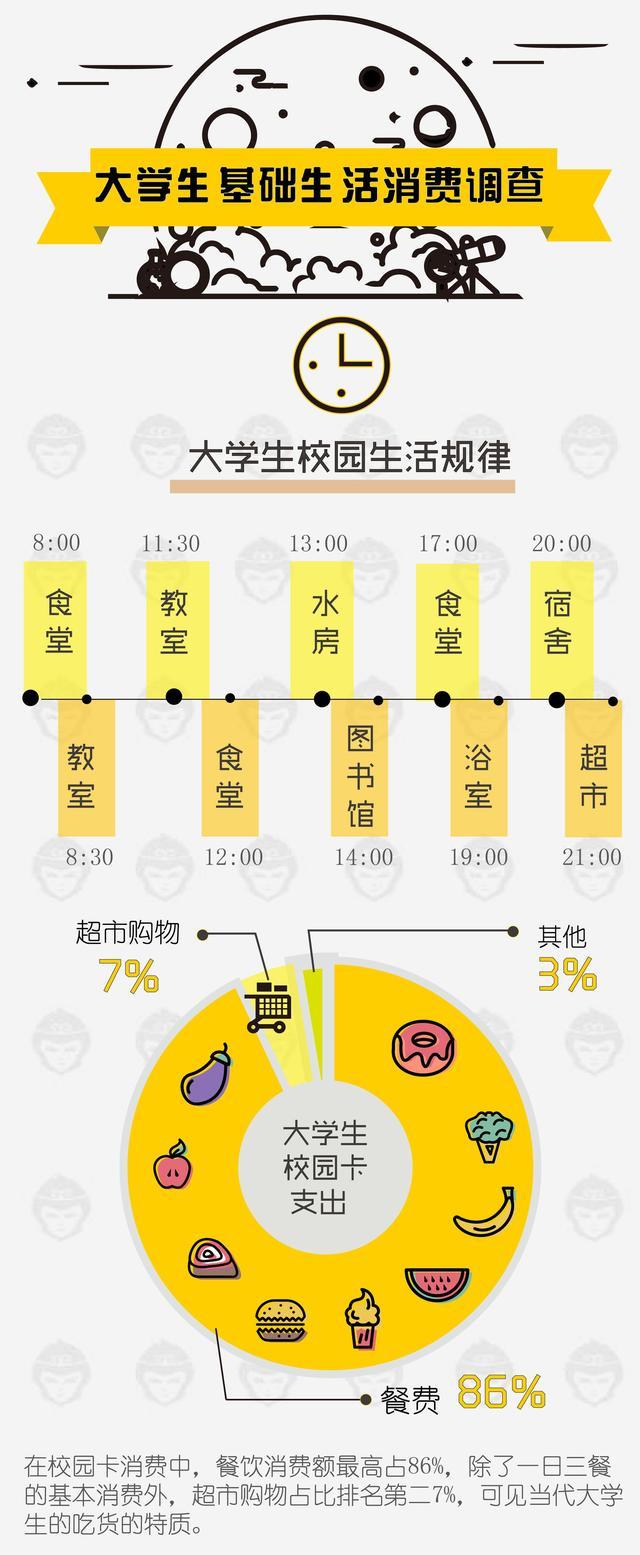 基礎(chǔ)生活消費(fèi)作為大學(xué)生日常生活重要的組成部分,是一個(gè)了解大學(xué)生的一個(gè)途徑,對(duì)于企業(yè)來說,也是一個(gè)不容忽視的潛在消費(fèi)市場(chǎng)。