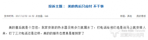 據公開信息顯示,該用戶家里安裝的熱水器“沒用多久就漏水了”,打電話聯系售后人員進行維修,美的售后服務方面則“老是說馬上就安排人來,打了三次電話還是這樣”。
