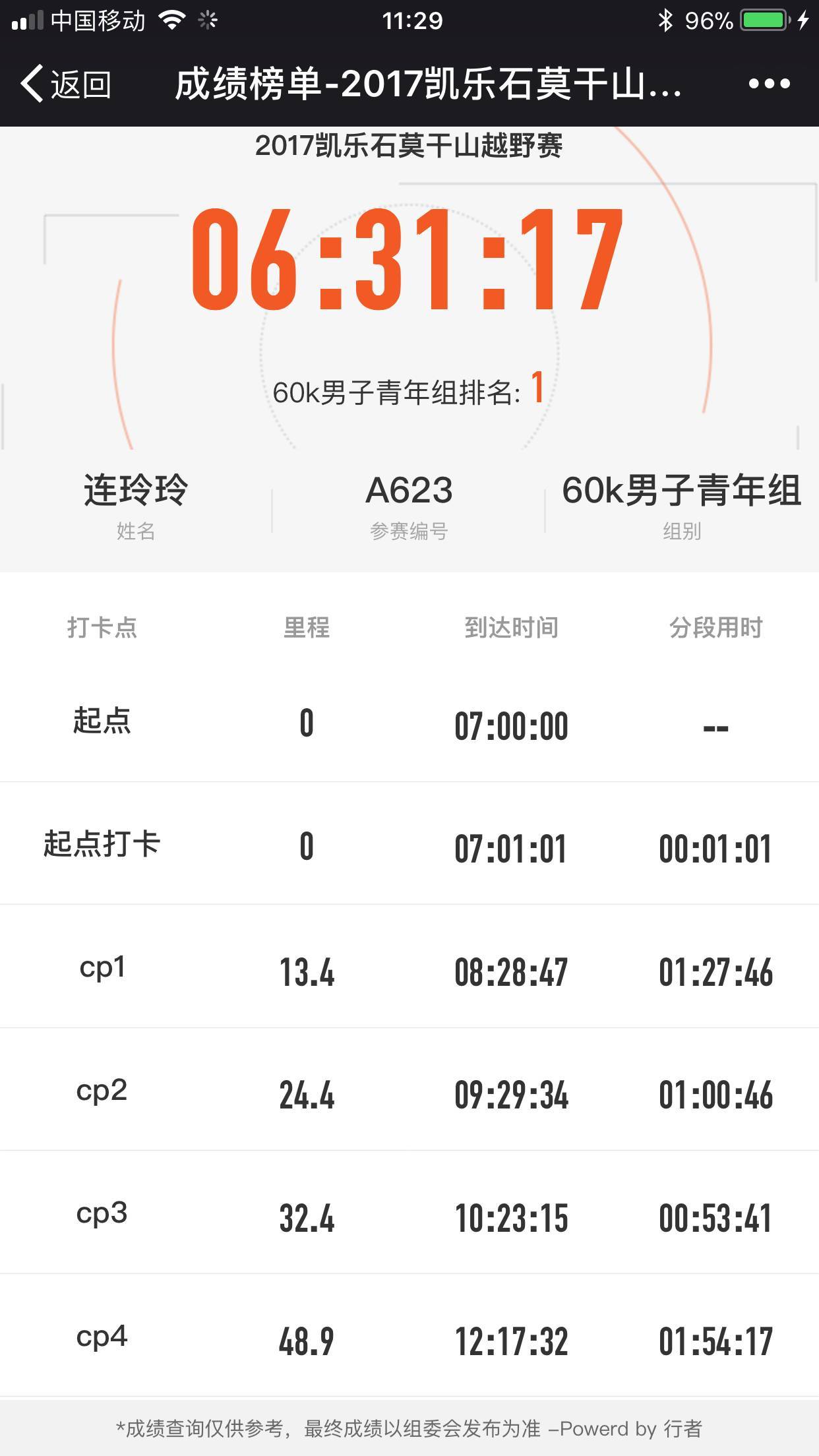 對(duì)于參賽選手而言,行者賽事系統(tǒng)能幫他們隨時(shí)了解成績(jī)。在每個(gè)打卡點(diǎn),都提供有“成績(jī)查詢”二維碼,只需微信“掃一掃”,各個(gè)CP點(diǎn)用時(shí)信息盡在掌控中。這一功能在參賽選手中廣受好評(píng)。