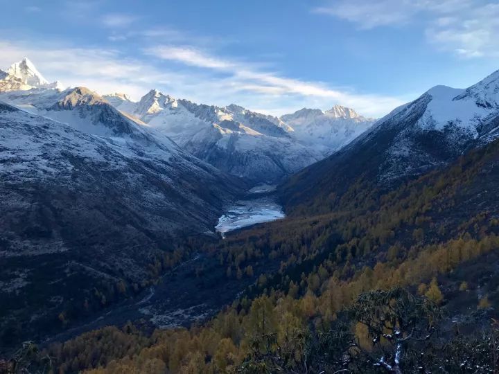 跋涉了1個(gè)多小時(shí)后,一幅驚艷無比的“千里江山圖”突然鋪展在跑者們的眼前。四姑娘山連綿起伏的雪峰,在晨光當(dāng)中被鍍上了一層燦爛的金色,熠熠生輝,圣潔神秘。