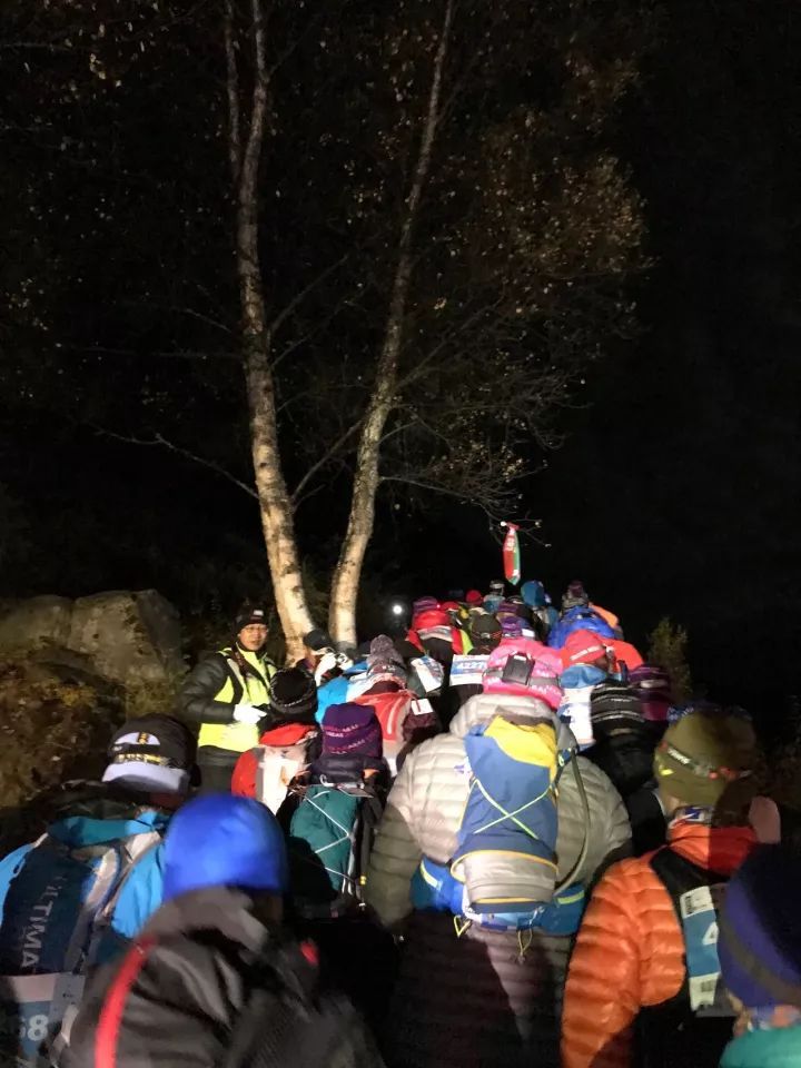 天上的星光與大地的“星光”遙相呼應(yīng),選手們頭上的燈光“照料”著彼此的道路,經(jīng)過了最初的興奮,我們都在海拔3400米上的賽道上默默前行。此時(shí),靜水流深,越是沉穩(wěn)趕路的跑者,越是經(jīng)驗(yàn)豐富的老手。精英跑者就像吝嗇的守財(cái)奴一樣,不肯多花一丁點(diǎn)兒的力氣去做多余的事情。山區(qū)里的太陽仿佛因?yàn)槁吠酒閸缍鴬檴檨磉t。濃墨大地,混沌一團(tuán),點(diǎn)點(diǎn)星光,匯成一線,仿如長(zhǎng)蛇,蜿蜒潛行。