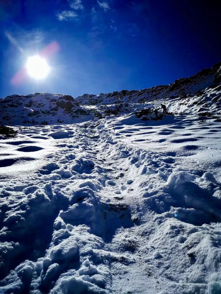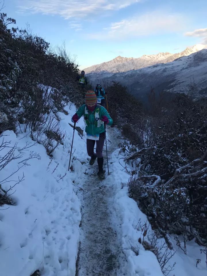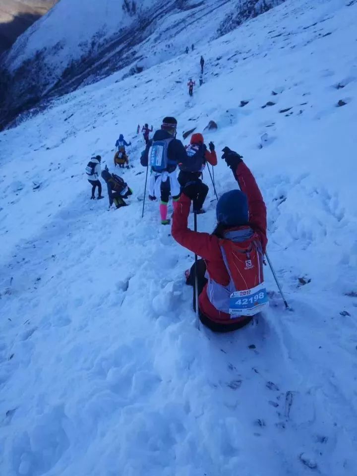 “逝者如斯夫,不舍晝夜。”時(shí)間流逝在我們與及膝大雪中的掙扎當(dāng)中,從CP2出來到爬完冰雪賽道足足過去了3個(gè)多小時(shí),重新再踏上堅(jiān)實(shí)路面時(shí)候,體能已是急劇透支,饑餓感覺隨之而來,雙腳發(fā)酸發(fā)軟,一路踉踉蹌蹌,時(shí)不時(shí)就會(huì)因?yàn)樘雀叨炔蛔愣皇^撂倒。就這樣,慢慢走、慢慢吃、慢慢喝,等待體力一點(diǎn)點(diǎn)恢復(fù)。這首次高原雪山賽幸虧有經(jīng)驗(yàn)豐富的“樂叔”指點(diǎn),讓我把“凱樂石900羽絨服”穿在越野背包外面,這個(gè)提醒確實(shí)太重要了,不僅達(dá)到了保護(hù)的效果,而且還用自己的體溫不斷“加熱”軟水壺。