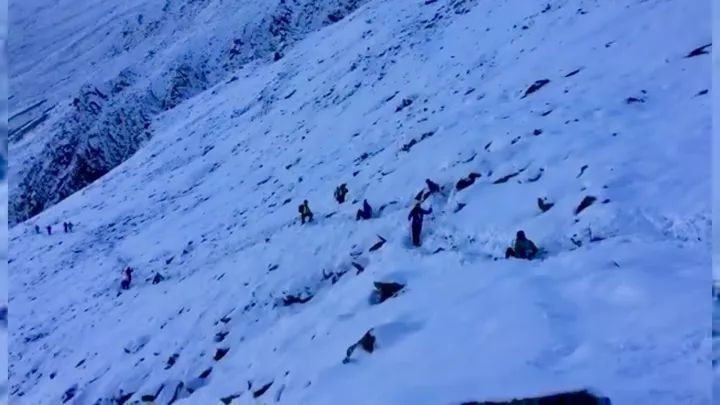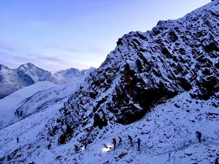 從雪山腳下一路向上,只為攀登,茫茫雪峰看似觸手可及,然而把你從思海的浪漫世界拖回艱難現(xiàn)實(shí)場(chǎng)景的正是你的目光。在白茫茫的冰天雪地中散落了一長(zhǎng)串色彩斑斕的“巧克力豆”。