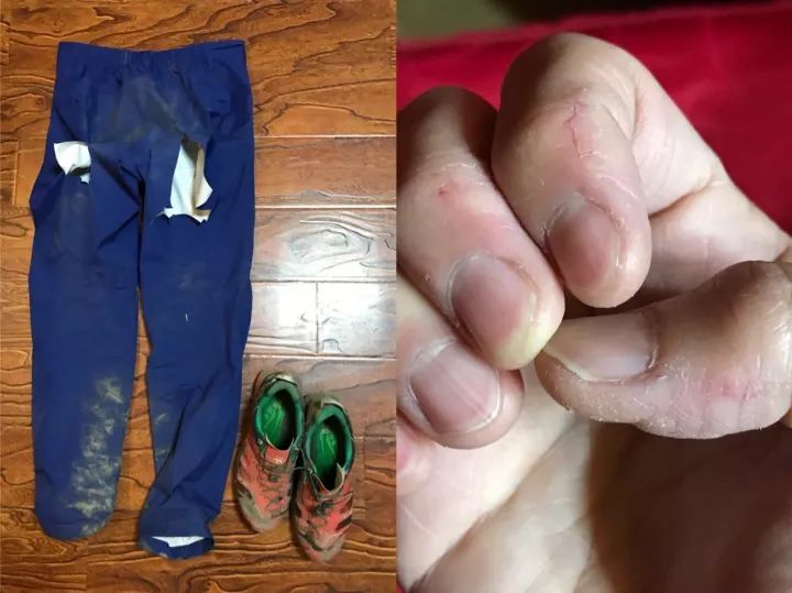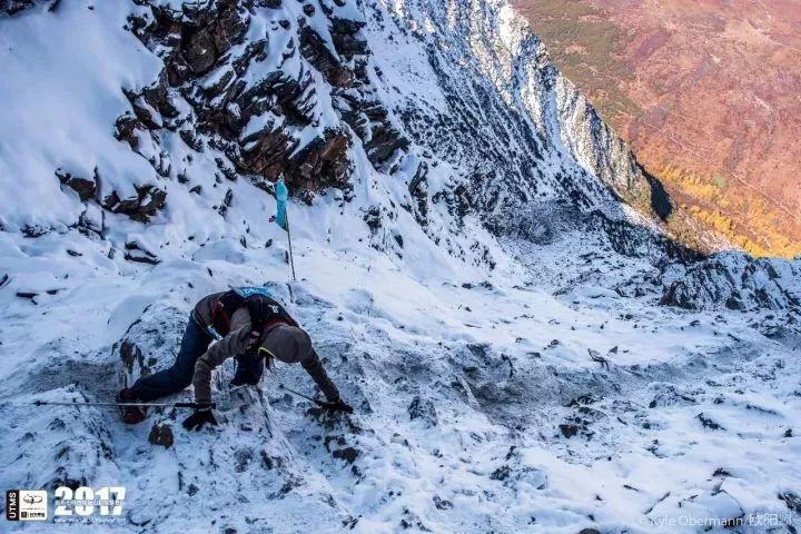 雖然我們都嚴(yán)格按照賽事主辦方要求佩戴了可以遮蓋手指的手套,但還是遠(yuǎn)遠(yuǎn)低估了雪峰北臉的低溫。CP1向CP2的雪峰爬坡,盡管全程溫度也比較低,但那只算得上是“寒冷”,速度快、發(fā)熱大,其實(shí)也不覺得雪峰的“冷”有什么可怕。背陽面的雪峰不僅溫度更低,而且面對(duì)接近垂直的陡峭下坡經(jīng)常需要手腳并用。薄薄的越野手套插在厚厚的積雪里面,尖銳的寒意可是透骨而來。我的手指很快就失去了知覺,然后是劇痛,每一次為了支撐身體的穩(wěn)定而不得不借助手臂的時(shí)候,接觸到任何東西,指尖的痛楚都會(huì)透徹心扉。