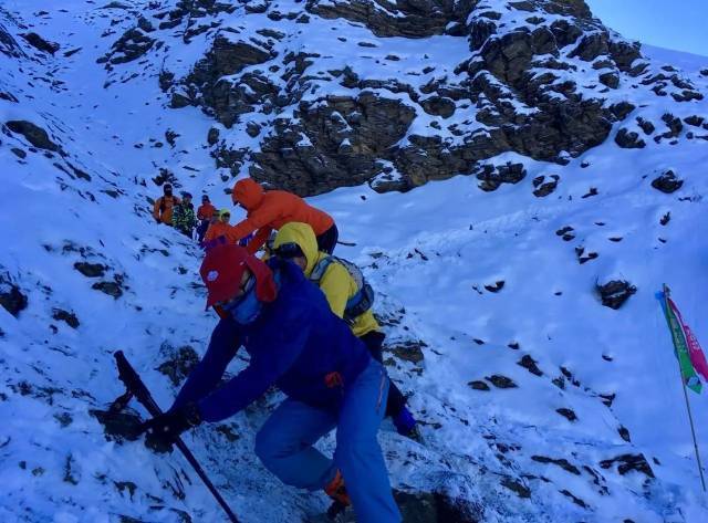 細(xì)看之下,這些大小、距離不一的彩豆正如螞蟻般沿著“之”字型線路一點(diǎn)一點(diǎn)地挪動(dòng),他們正是你的“前輩”,而你心里很清楚,不久之后,你也將成為這條彩色長(zhǎng)串上的其中一顆小豆豆,你身披的“凱樂石橙色羽絨服“也會(huì)被當(dāng)做指引“后輩”繼續(xù)前行的鮮明標(biāo)識(shí)。