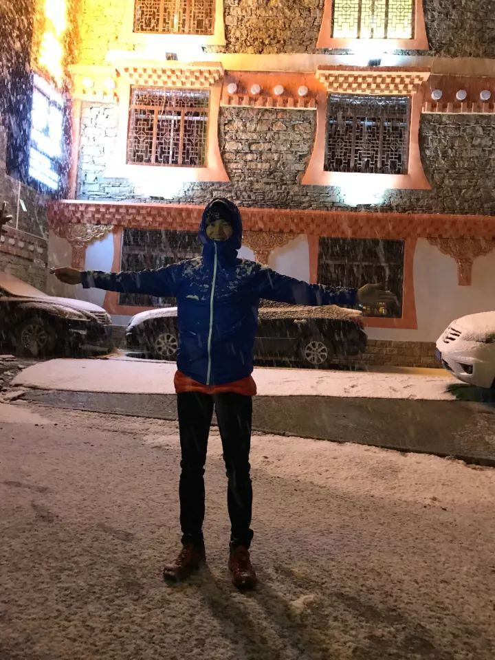 讓人心生畏懼的是你不會(huì)知道下面掩埋的是什么,可能是平整的巖層,可能是散亂的碎石,可能是尖銳的菱角,而最恐怖的殺機(jī)是大雪下隱藏著像剃須刀一樣鋒利的薄巖石,它能像利刃切割芝士一般,切開一切的附著物。一旦碰上,后果堪然。我便是接連幾次撞上了,幸虧有“達(dá)達(dá)”提前為我準(zhǔn)備的“凱樂石防水沖鋒褲”的保護(hù),雖痛無傷,然而事后方知沖鋒褲的屁股部位已被割得成兩片大蒲扇,一路在風(fēng)中飄蕩。若非有它的鞠躬盡瘁,我知道血肉模糊的肯定是我的身體。
