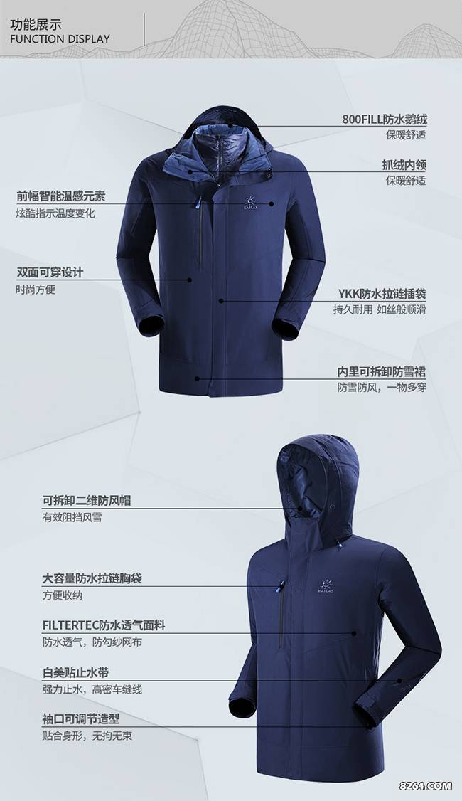 羽絨內(nèi)膽:填充800Fill高蓬松Teflon?羽絨防護(hù)科技拒水羽絨,鎖熱保暖,快速干燥;拒水保暖,保護(hù)你免受酷寒侵襲