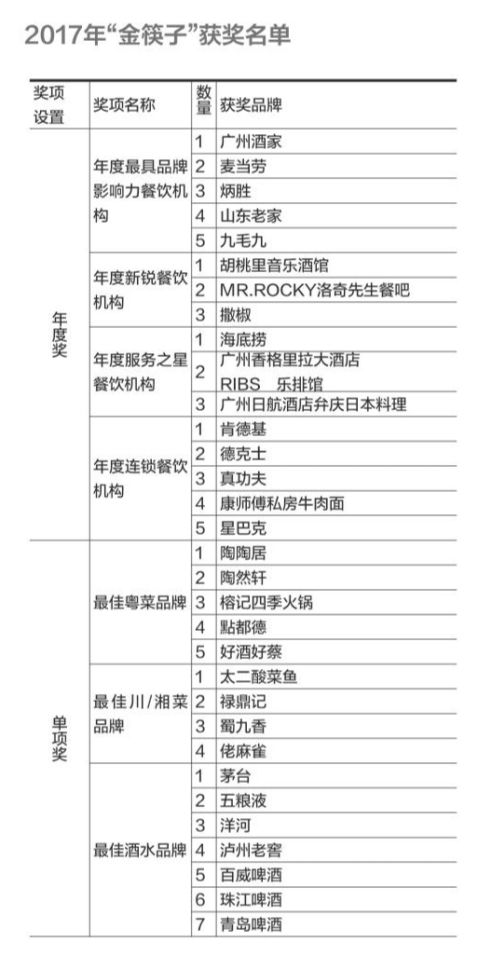 \u00A0\u00A0\u00A0\u00A0南都記者了解到,在最重磅的“年度最具品牌影響力餐飲機構(gòu)”獎項評選中,今年成功上市的廣州酒家以7票全票通過,成了評委團眼中的紅人,前不久因改名“金拱門”引起轟動的麥當(dāng)勞也手握4票。在評委陳瑞杰看來,麥當(dāng)勞是具有全球影響力的知名餐飲品牌,實至名歸。在最佳粵菜品牌獎項評選中,近幾年來因品牌重新定位而煥發(fā)生機、蓬勃發(fā)展的百年老字號粵菜品牌陶陶居表現(xiàn)不俗,捧得最佳粵菜品牌。此次金筷子獎,九毛九餐飲成大贏家,除九毛九品牌本身獲年度服務(wù)之星餐飲機構(gòu)稱號外,旗下新創(chuàng)子品牌太二酸菜魚獲最佳川菜品牌,有專家評委意見顯示,九毛九旗下品質(zhì)有保證。在最佳酒水品牌榜單,茅臺、五糧液、洋河、百威啤酒等均榜上有名。