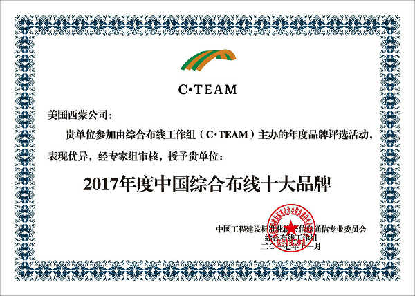 \u00A0\u00A0\u00A0\u00A0最后,本次年度論壇揭曉了2017年度中國(guó)綜合布線十大品牌。“中國(guó)綜合布線十大品牌”評(píng)選活動(dòng)是綜合布線工作組基于對(duì)綜合布線產(chǎn)業(yè)的長(zhǎng)期關(guān)注和理解,以及對(duì)于品牌競(jìng)爭(zhēng)力的透徹分析,權(quán)威開(kāi)展的重要工作內(nèi)容之一。該評(píng)選活動(dòng)到2017已持續(xù)八年,在業(yè)界獲得了良好的公信力,是國(guó)內(nèi)綜合布線領(lǐng)域公認(rèn)的、最權(quán)威的品牌評(píng)獎(jiǎng)活動(dòng)。美國(guó)西蒙已經(jīng)連續(xù)8年榮獲了“中國(guó)綜合布線十大品牌”大獎(jiǎng)。