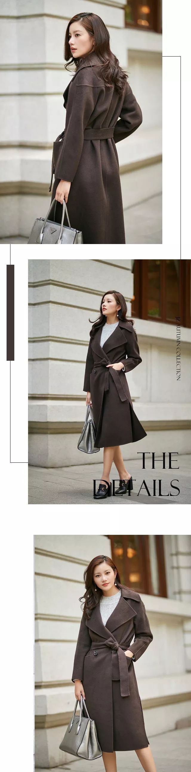 近年來睡衣風(fēng)大行其道,睡袍感的同色腰帶與領(lǐng)型,讓雅致的咖啡色大衣更多了一分隨性與慵懶。