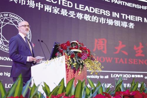 12月3日,2017年周大生(002867)公司加盟商大會迎來了比利時貴賓,世界鉆石業(yè)的重量級人物——國際鉆石設計與切磨大師加比.托考夫斯基先生(GabiTolkowsky)與戴比爾斯集團IIDGR國際鉆石分級與研究機構總裁喬納森.肯德爾先生(JonathanKendall)。