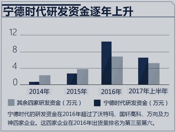 從研發(fā)費用上可以看出,寧德時代對于技術(shù)研發(fā)很重視。從2014年至今,累計投入研發(fā)費用達(dá)20.8億元,呈逐年上漲趨勢;今年前三季度,涉及動力電池的投資擴產(chǎn)項目的總資金規(guī)模超過720億元,已經(jīng)超過2016年出貨量第三至第六的沃特瑪、國軒高科、萬向及力神四家公司的研發(fā)經(jīng)費總和。在產(chǎn)品應(yīng)用中,寶馬X1、奔馳EQA等車型都將運用最新的三元鋰動力電池組,而國內(nèi)自主品牌北汽、上汽、吉利等六家企業(yè),已經(jīng)把寧德時代產(chǎn)品搭載于自己品牌下的EV與PHEV車型上。