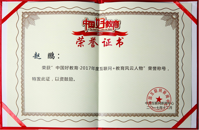 津橋國(guó)際董事長(zhǎng)趙鵬先生榮獲2017年度“互聯(lián)網(wǎng)+教育風(fēng)云人物”稱(chēng)號(hào)