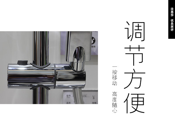 法恩莎恒溫花灑F2H9031SC的一按式上下移動,讓你隨心所欲調整花灑掛置的高度。還貼心配置可拆式掛鉤,方便鉤掛毛巾或其他沐浴用品。不需要使用時,還可以拆下來作為備用掛鉤。