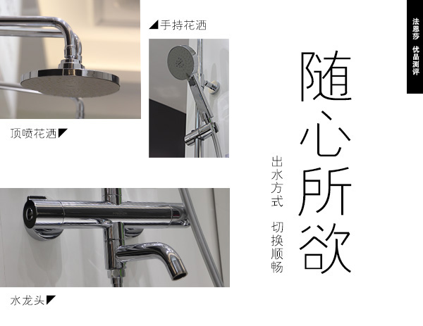 雨淋水、按摩水、雨淋+按摩水三種出水方式切換順暢,符合你隨時變換的心情,玩轉水趣。而且法恩莎恒溫花灑F2H9031SC還有頂噴花灑、手持花灑、水龍頭三重功能,隨心使用,方便快捷,簡化生活。