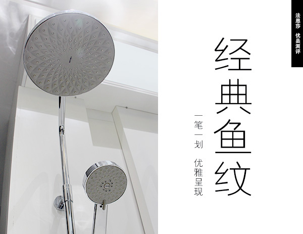 法恩莎恒溫花灑F2H9031SC所精心雕琢的經(jīng)典魚紋,以簡單流暢的線條,完美地勾勒出花灑和頂噴優(yōu)美曲線,加上精湛的工藝,讓你的花灑與眾不同。一筆一劃,都是法恩莎設計師對輕奢主義的品質追求。