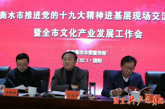 河北共產(chǎn)黨員網(wǎng)衡水訊(記者扈文立通訊員張婷婷付冠珠) 12月1日,衡水市推進(jìn)黨的十九大精神進(jìn)基層現(xiàn)場(chǎng)交流會(huì)暨全市文化產(chǎn)業(yè)發(fā)展工作會(huì)在饒陽(yáng)縣召開,市委常委、宣傳部長(zhǎng)馬福華出席會(huì)議并講話,饒陽(yáng)縣委書記吳波陪同參觀并參加會(huì)議,市委宣傳部常務(wù)副部長(zhǎng)楊鎖柱主持會(huì)議。市委辦公室、市委組織部、市委市直工委、市委教育工委、市編辦、市發(fā)改委、市人社局、市工信局分管負(fù)責(zé)同志;市委宣傳部部務(wù)會(huì)成員及各科室(局、辦)主要負(fù)責(zé)同志;市直宣傳文化系統(tǒng)各單位主要負(fù)責(zé)同志;各縣(市、區(qū))委常委、宣傳部長(zhǎng),主管基層宣傳工作及文化產(chǎn)業(yè)發(fā)展工作的副部長(zhǎng);高新區(qū)、濱湖新區(qū)主管負(fù)責(zé)同志;各鄉(xiāng)鎮(zhèn)(街道)宣傳委員;衡水老白干集團(tuán)、衡水學(xué)院、衡水職業(yè)技術(shù)學(xué)校黨委宣傳部負(fù)責(zé)同志等共約200人參加會(huì)議。