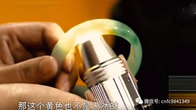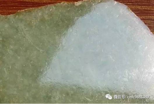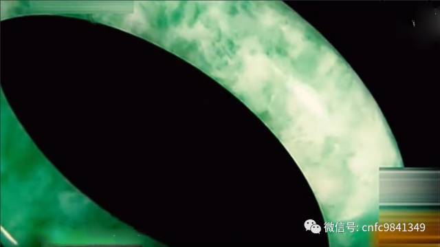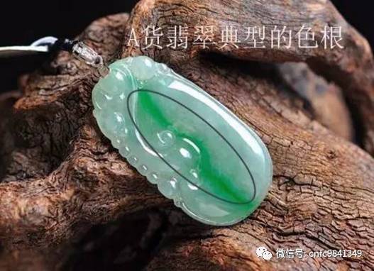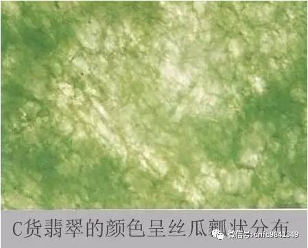 C貨翡翠的染色帶與周圍的淺色部分的界線模糊,而天然翡翠的顏色部分與周圍的淺色部分較為截然。