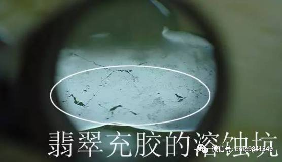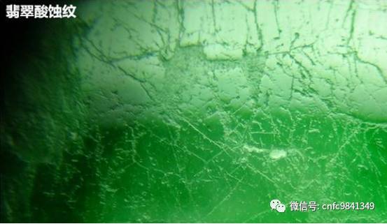 用放大鏡觀看,經(jīng)過酸洗的翡翠,會有蜘蛛網(wǎng)狀的酸蝕紋。