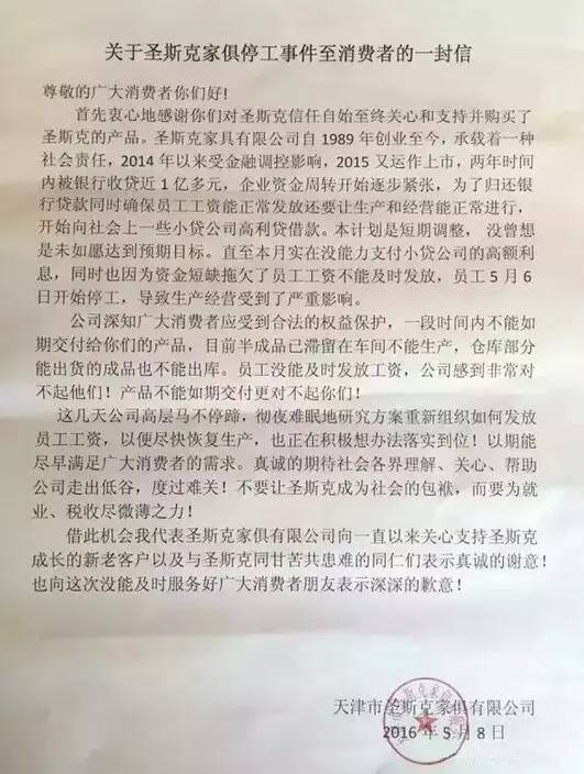 圣斯克家具集團成立于1989年,工廠面積16萬平方米,高峰期員工曾達2600余人。2015年,圣斯克申請在新三板上市,最終并未成功,或是讓圣斯克陷入困境的原因之一。除此之外,2014年的金融調(diào)控也讓公司受到影響。在停工事件發(fā)生后,5月8日,圣斯克家具發(fā)布相關(guān)聲明: