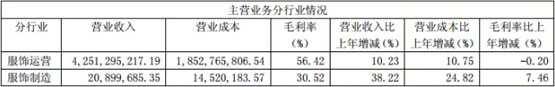 其中,服飾零售業(yè)務(wù)是集團(tuán)主要收入來源,營(yíng)收同比增長(zhǎng)10.23%至42.5億元,服飾制造業(yè)務(wù)營(yíng)收則同比大漲38.22%至2089萬。來自直營(yíng)零售渠道的銷售額同比上漲5.24%至17.57億元,加盟店業(yè)務(wù)銷售額則幾乎與去年同期持平,錄得14.49億元,聯(lián)盟店業(yè)務(wù)同比大跌20.24%至7.72億元。