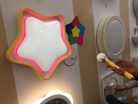 除此之外,智能產(chǎn)品也格外引人注意,在一款專門為兒童設(shè)計(jì)的智多星燈面前,五角星的造型加上滿天星高光面罩設(shè)計(jì),讓人第一眼就被它可愛的造型所吸引。除了造型及材質(zhì),其獨(dú)特的魔術(shù)變色功能,讓很多父母愿意選擇這款有趣的燈具,讓孩子的居住環(huán)境充滿童真樂趣。