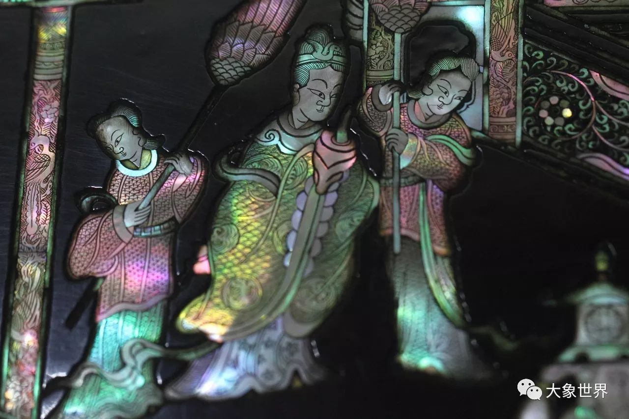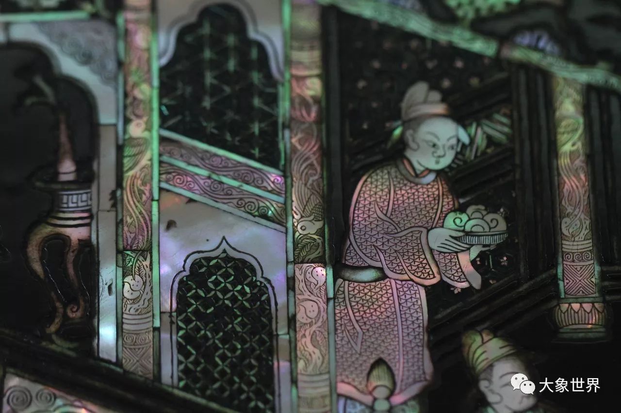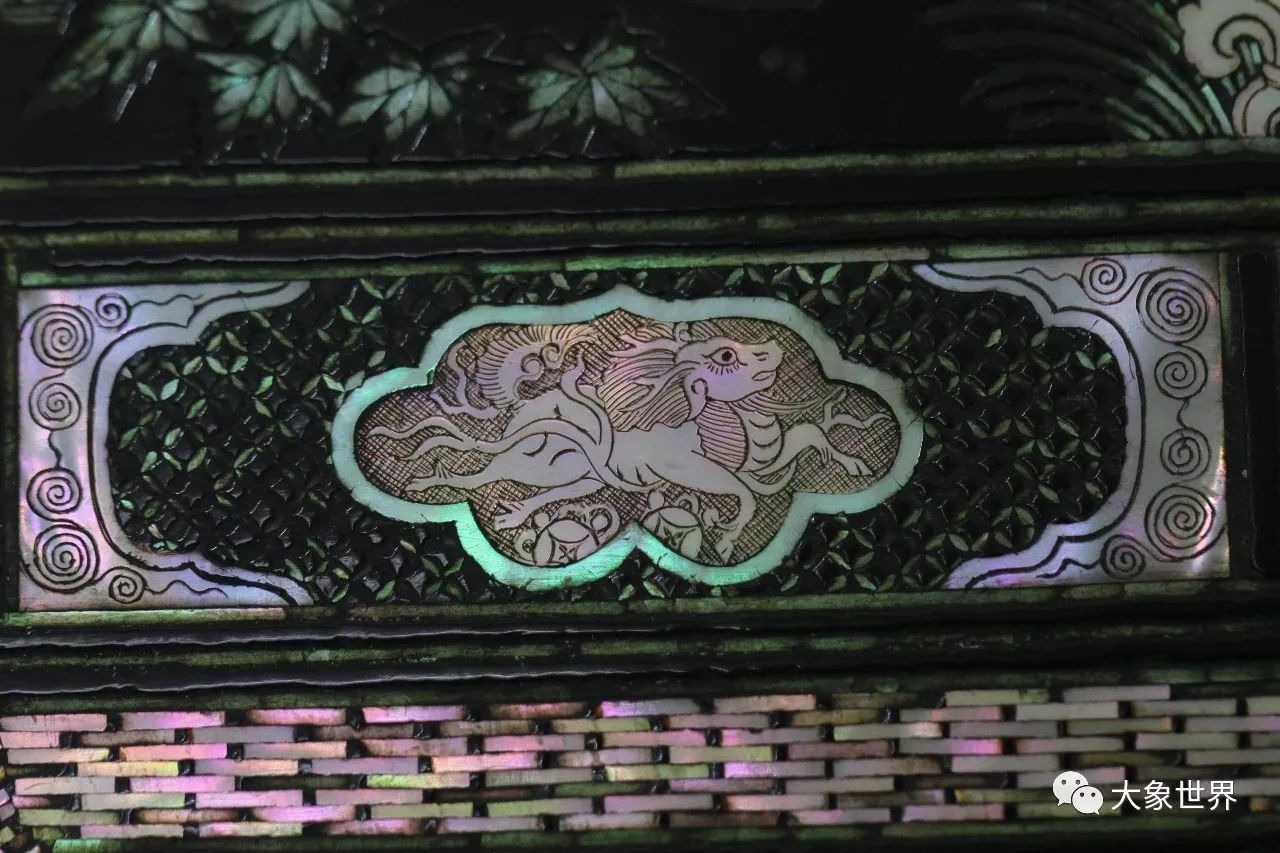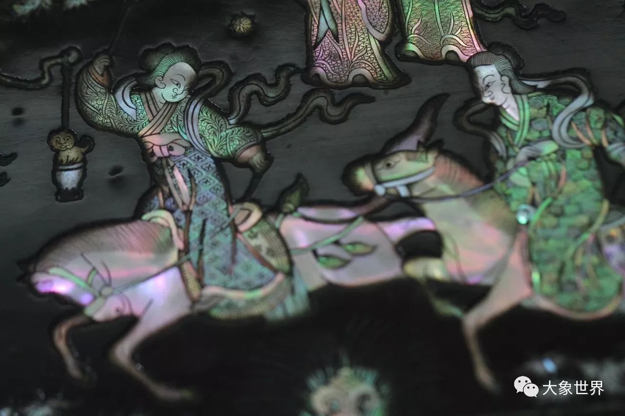 明末清初的劉應(yīng)賓有這樣一句詩(shī):“螺鈿妝成翡翠光”,一直以來(lái)被用來(lái)贊頌螺鈿工藝,事實(shí)上,我們?cè)诒@A誼庫(kù)房所見到的這一件,華美高貴,賞心悅目,五光十色的炫目,給人的感動(dòng),絕對(duì)不是翡翠之光堪比了。