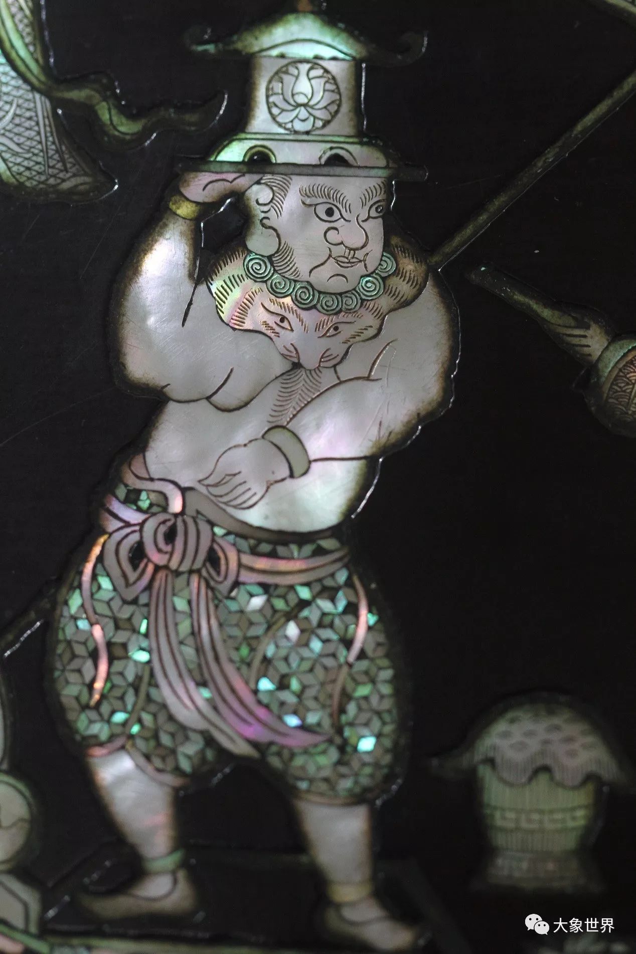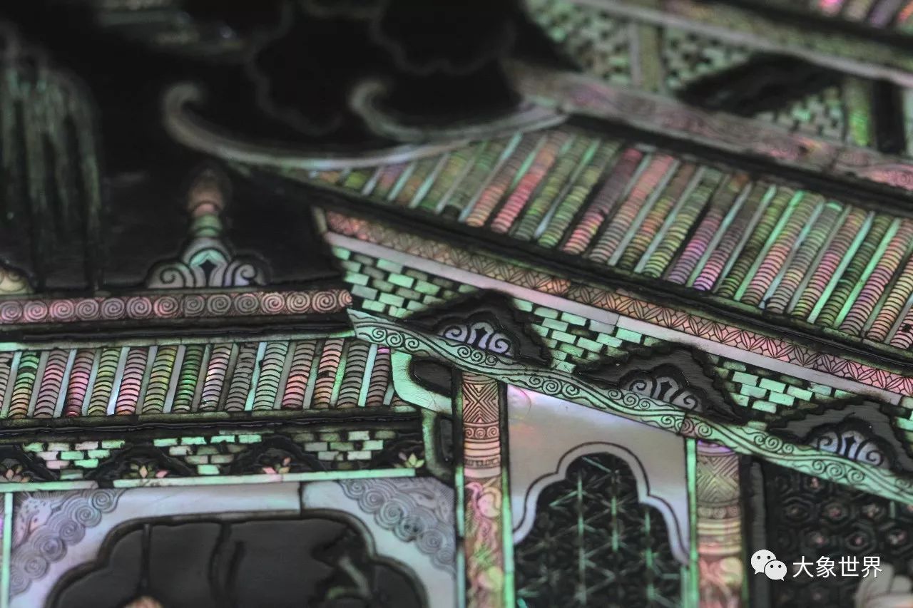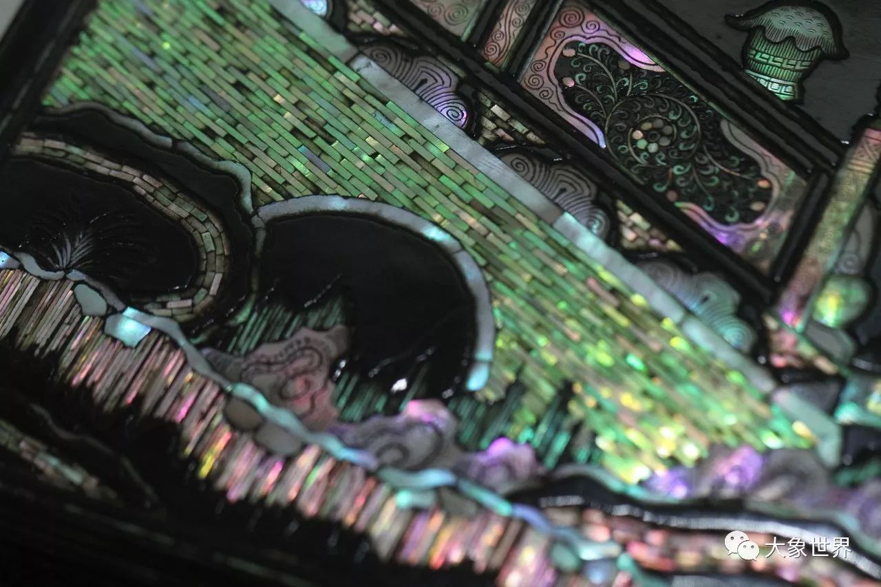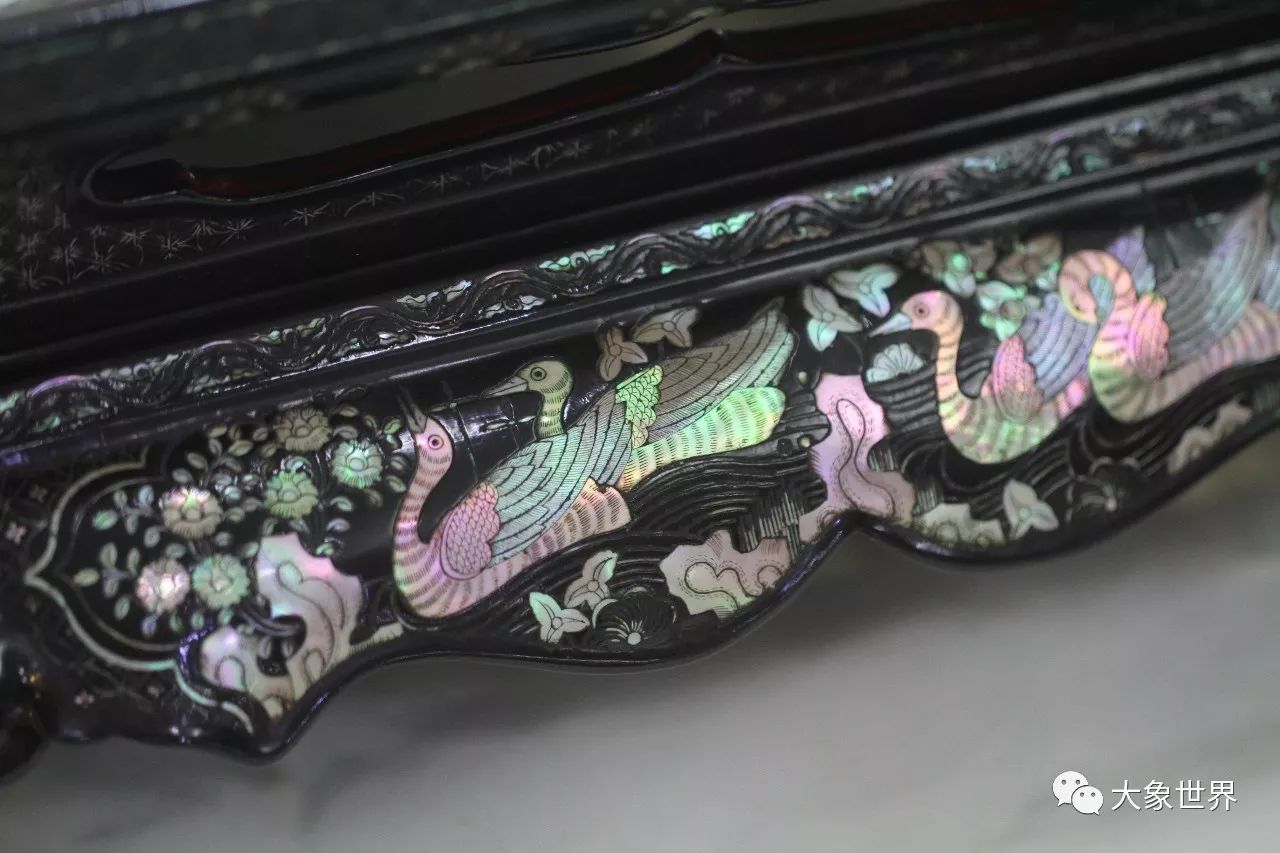 明末清初的劉應(yīng)賓有這樣一句詩(shī):“螺鈿妝成翡翠光”,一直以來(lái)被用來(lái)贊頌螺鈿工藝,事實(shí)上,我們?cè)诒@A誼庫(kù)房所見到的這一件,華美高貴,賞心悅目,五光十色的炫目,給人的感動(dòng),絕對(duì)不是翡翠之光堪比了。