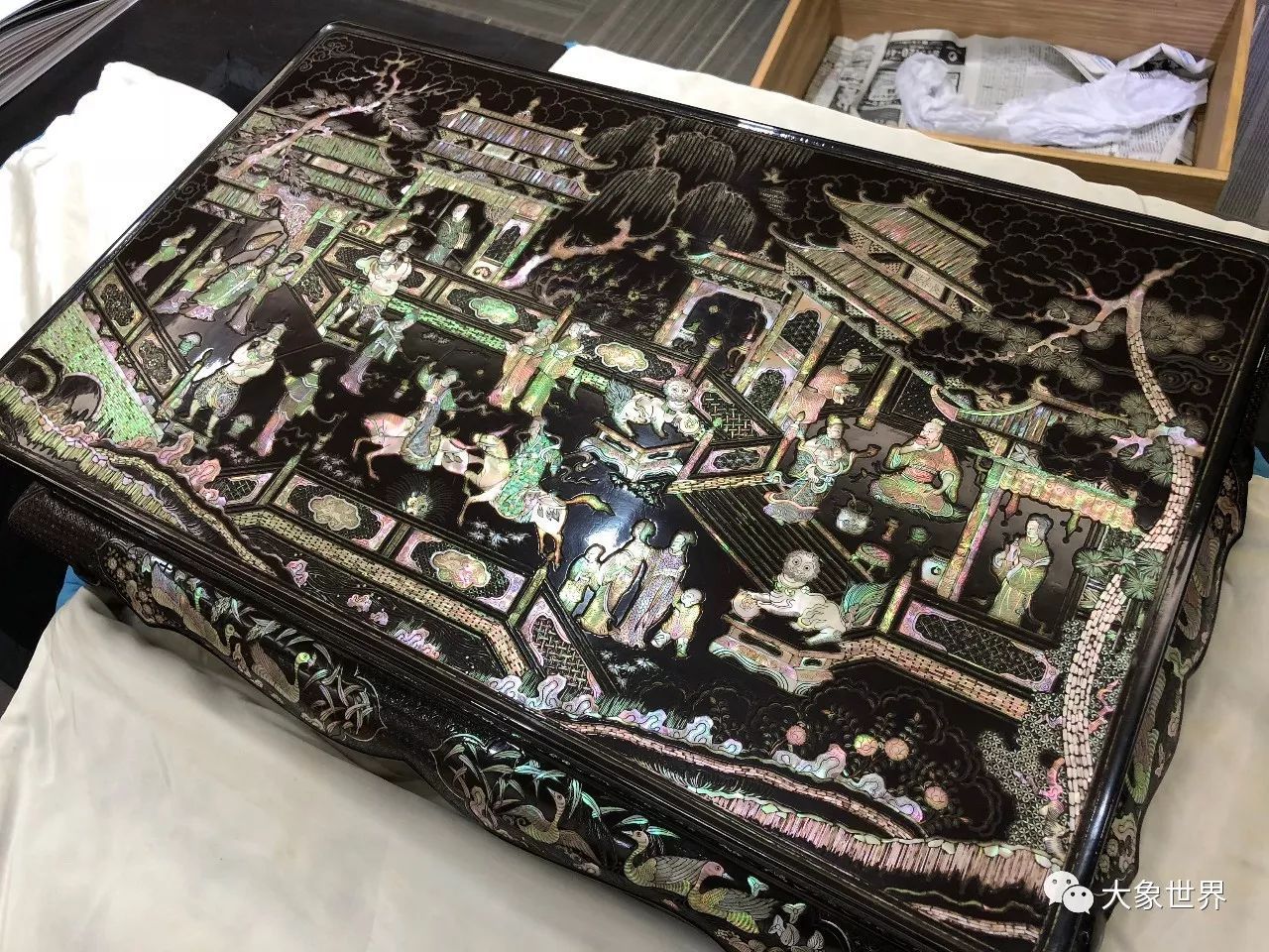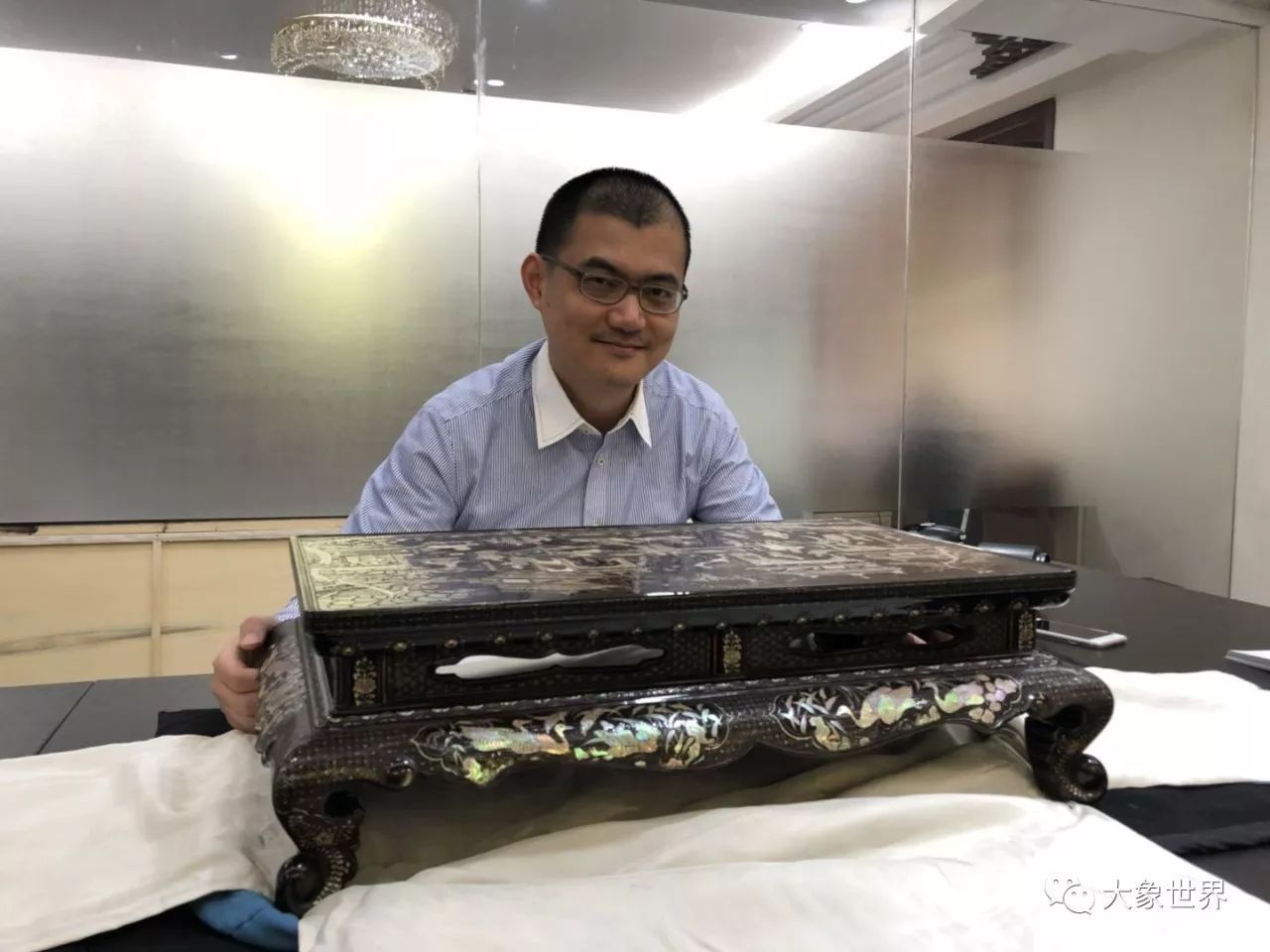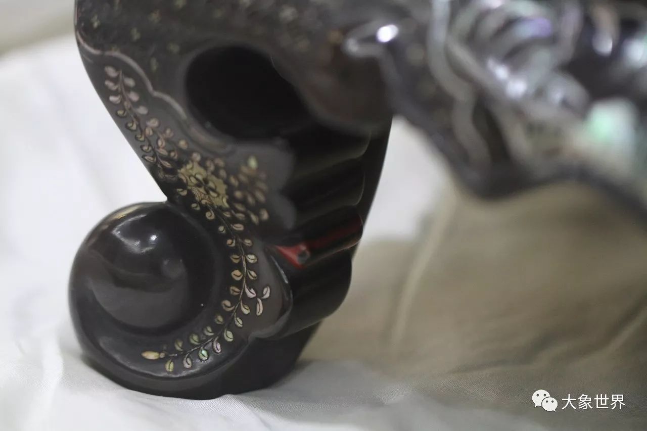 看了這樣幾張局部,您是不是覺得已經(jīng)夠絢爛了呢,您當(dāng)然也可以想象一下,當(dāng)這件藏品整體呈現(xiàn)在您面前的時(shí)候,會(huì)產(chǎn)生怎樣震撼的視覺沖擊力了!這便是本次保利華誼秋拍即將呈現(xiàn)的一只元代黑漆嵌螺鈿戲劇故事香幾。大象在震撼之余,和它零距離的合了張影。