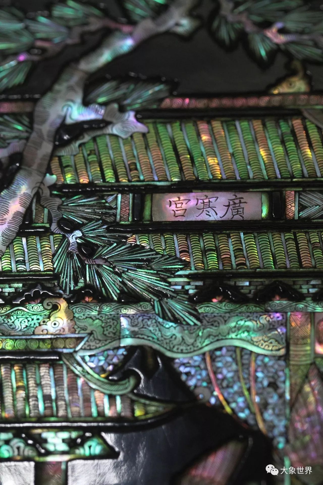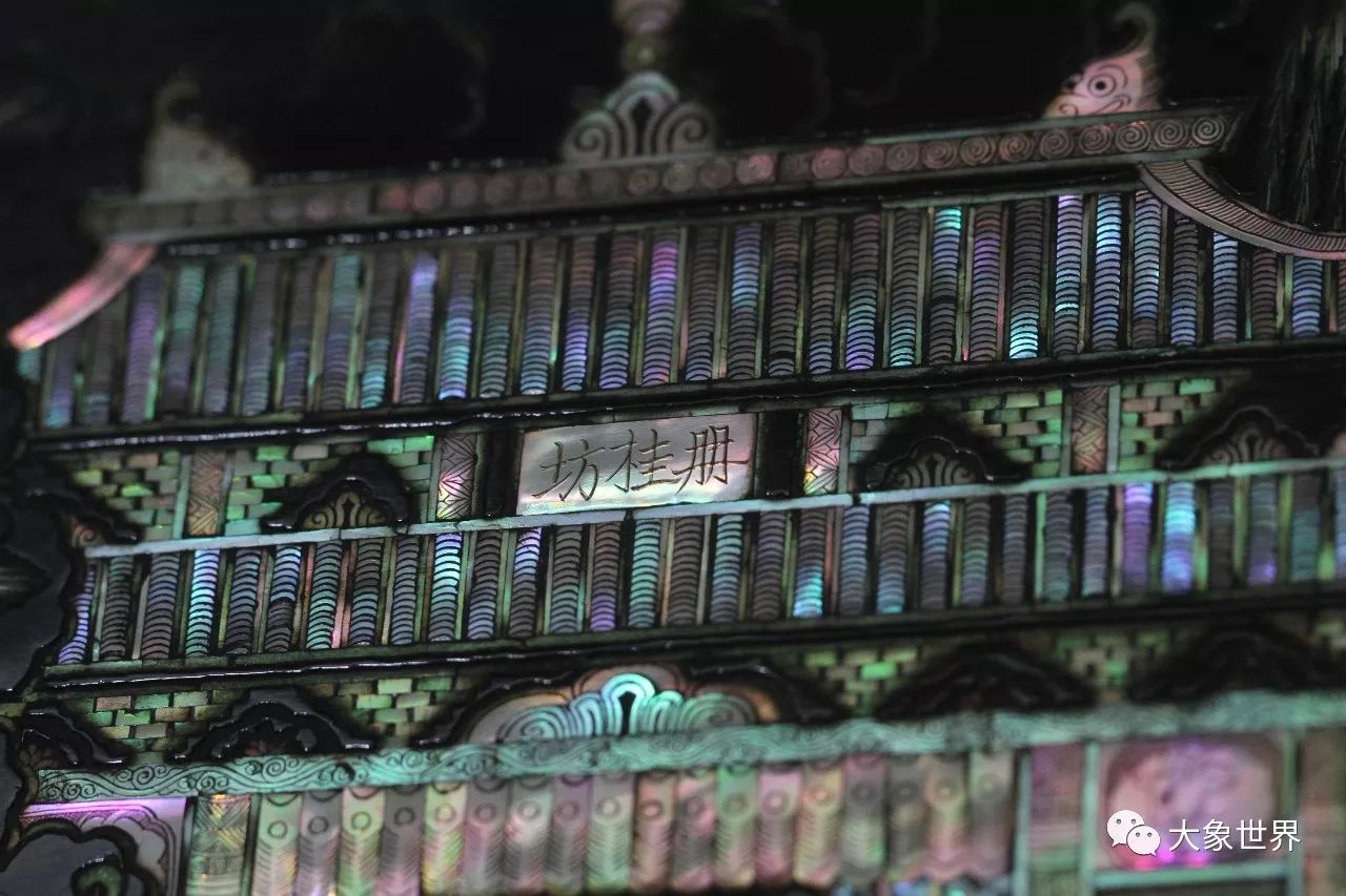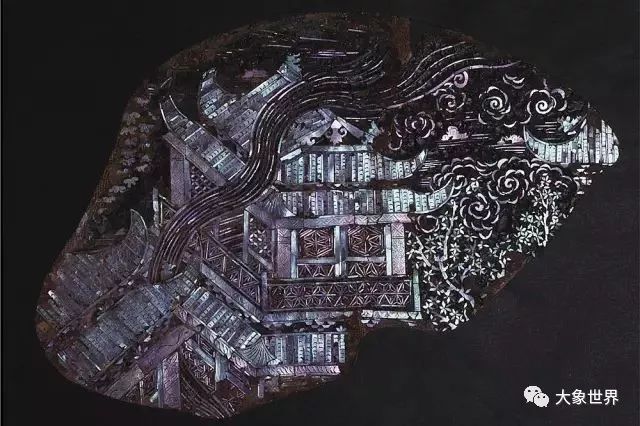 盤面用薄螺鈿嵌出兩層三間重檐歇山頂樓閣。因碎片中有“廣”字痕跡,與景物印證,遂定名為“廣寒宮圖”。樓閣后植樹,葉似梧桐丹桂,云氣自下騰空而上。不同物象,采用“分裁殼色,隨采而施綴”的做法,相較元代以前的厚螺鈿大大前進(jìn)了一步,《髹飾錄》楊明注謂“殼片古者厚,而今者漸薄也”,過去曾以為“今者”指明代,此殘片證明元代已有薄螺鈿漆工藝,且技法已相當(dāng)成熟。