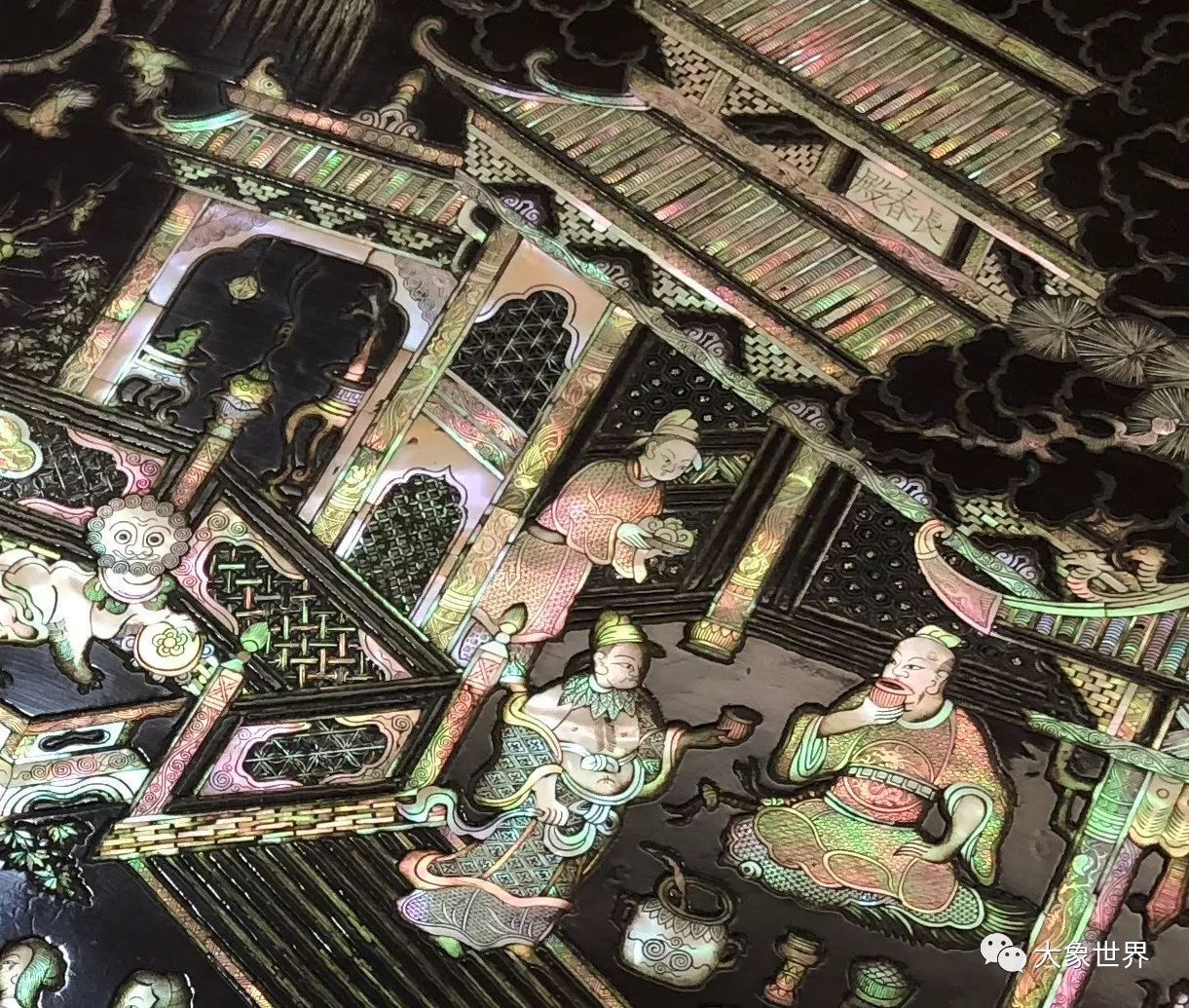 前文說(shuō)到,這種極致的螺鈿工藝在南宋時(shí)期就已經(jīng)被宋高宗吐槽太過于鋪張奢靡,因此,能夠做到這種極致工藝的,非皇家貴族無(wú)法擁有了。元代大文學(xué)家揭傒斯(1274—1344)在《贈(zèng)髹者黃生》中,描繪了一位黃姓漆工憑借自己精湛的工藝,在大都城游走于豪門之間,“黃氏擅良工,出入三十年。馳譽(yù)必名流,迎致皆上官”。