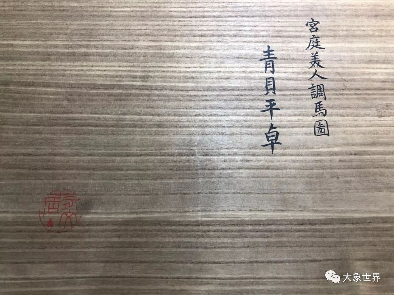 前文提到,這件香幾包裝極為精致,從木盒上看,顯然是日本藏家極為用心保存的藏品,木盒上寫著“宮廷美人調(diào)馬圖”