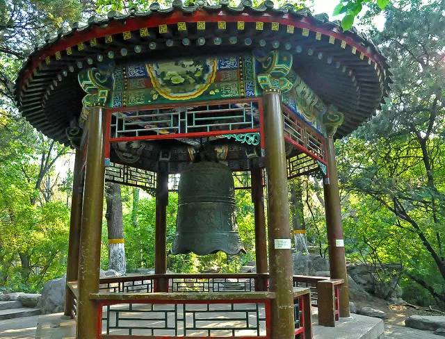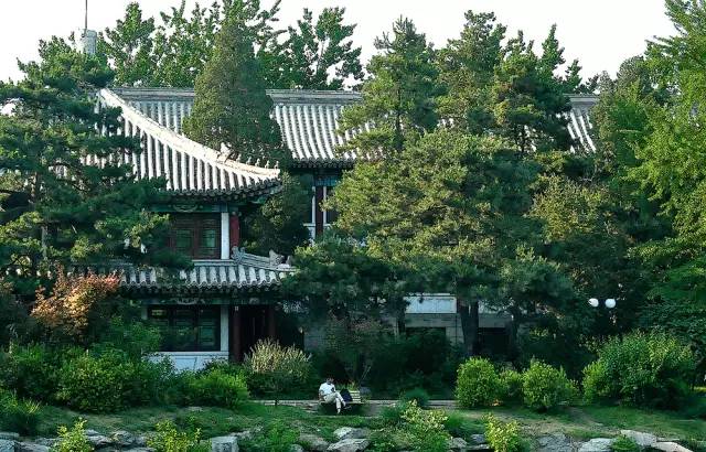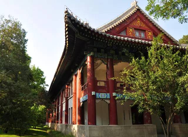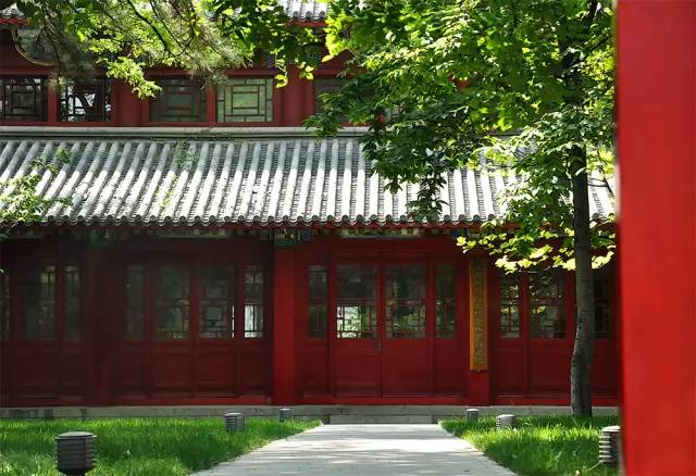 從西門進(jìn)入,正對(duì)著就是辦公樓。辦公樓的設(shè)計(jì)別具匠心。它體量高大,歇山式加廡殿的屋頂式樣與眾不同。對(duì)稱建筑布局,加上灰色大屋頂,紅色柱子,白色粉墻,藍(lán)綠色調(diào)為主的斗拱彩畫,形成了古樸高雅的色調(diào),莊重而寧?kù)o的氣氛,使人感到這里既不是皇家園林,也不是殿堂廟宇,而是古老的中國(guó)書院。