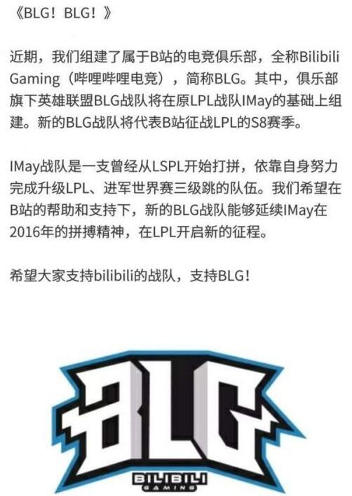 今天嗶哩嗶哩彈幕網公布了新動態,宣布成立bilibili Gaming(嗶哩嗶哩電競)簡稱BLG。其中俱樂部旗下的英雄聯盟BLG戰隊將在原LPL的IMay戰隊基礎之上組建。并將代表B站出征S8賽季: