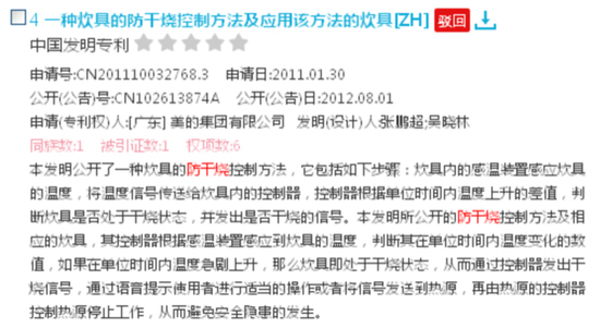 在海報(bào)中,提及“聽說美的發(fā)明的安全灶可以防干燒”。于是,記者在RainPat專利檢索網(wǎng)站上搜索關(guān)鍵詞“防干燒”的專利發(fā)現(xiàn),一共檢索到4個(gè)關(guān)于美的防干燒的專利。其中,第一個(gè)是觸摸灶的,里面提到防干燒;第二個(gè)是防干燒燃?xì)庠畹耐庥^專利;第三個(gè)是語音提示專利;而第四個(gè)“一種炊具的防干燒控制方法及應(yīng)用該方法的炊具”的防干燒發(fā)明專利,已被駁回。顯然,防干燒燃?xì)庠畎l(fā)明者必然是最早發(fā)明并上市的海爾燃?xì)庠睢?/p>
