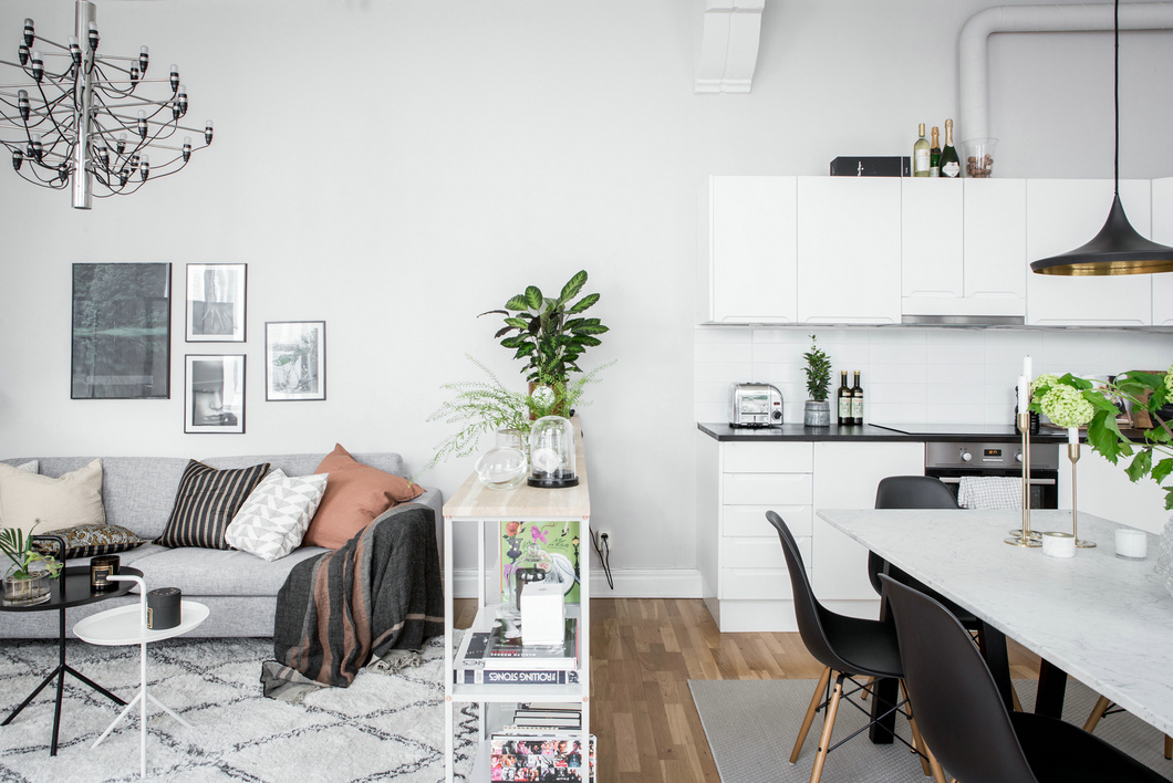 客餐廳之間利用金屬置物架進(jìn)行分割,不僅解決了儲物問題更是輕松的讓各功能區(qū)保持一定的獨立性,屋主十分擅長利用一些小飾物裝點空間,例如綠植、靠枕、燭臺,小巧的點綴增添空間的精致感。