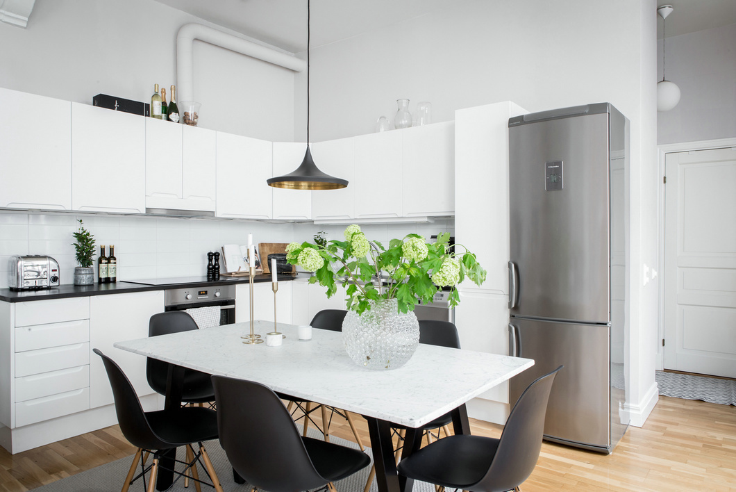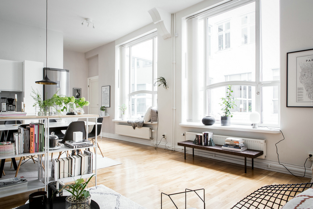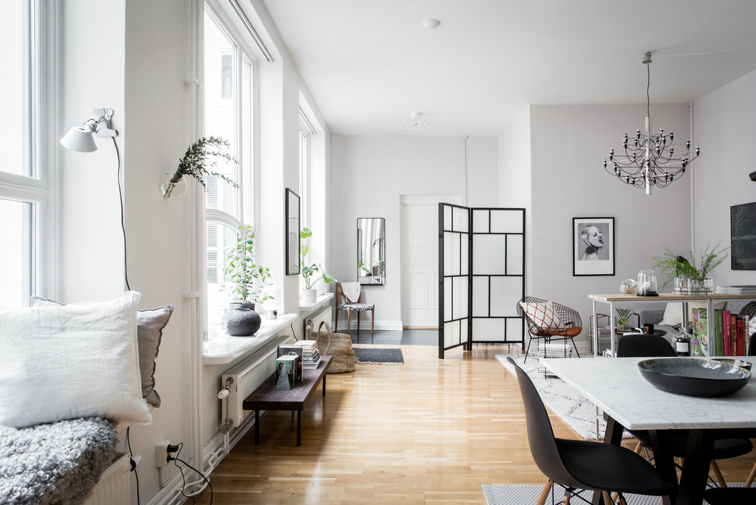 開放式的布局讓客餐廳的聯(lián)系更加的緊密,刻意在墻面開設(shè)的窗戶讓空間顯得通透明亮,純凈的白色調(diào)墻面,溫潤的木質(zhì)地板,中性的黑、白、灰三色搭配,加上豐富的織品,營造出北歐風(fēng)的溫暖與柔和。