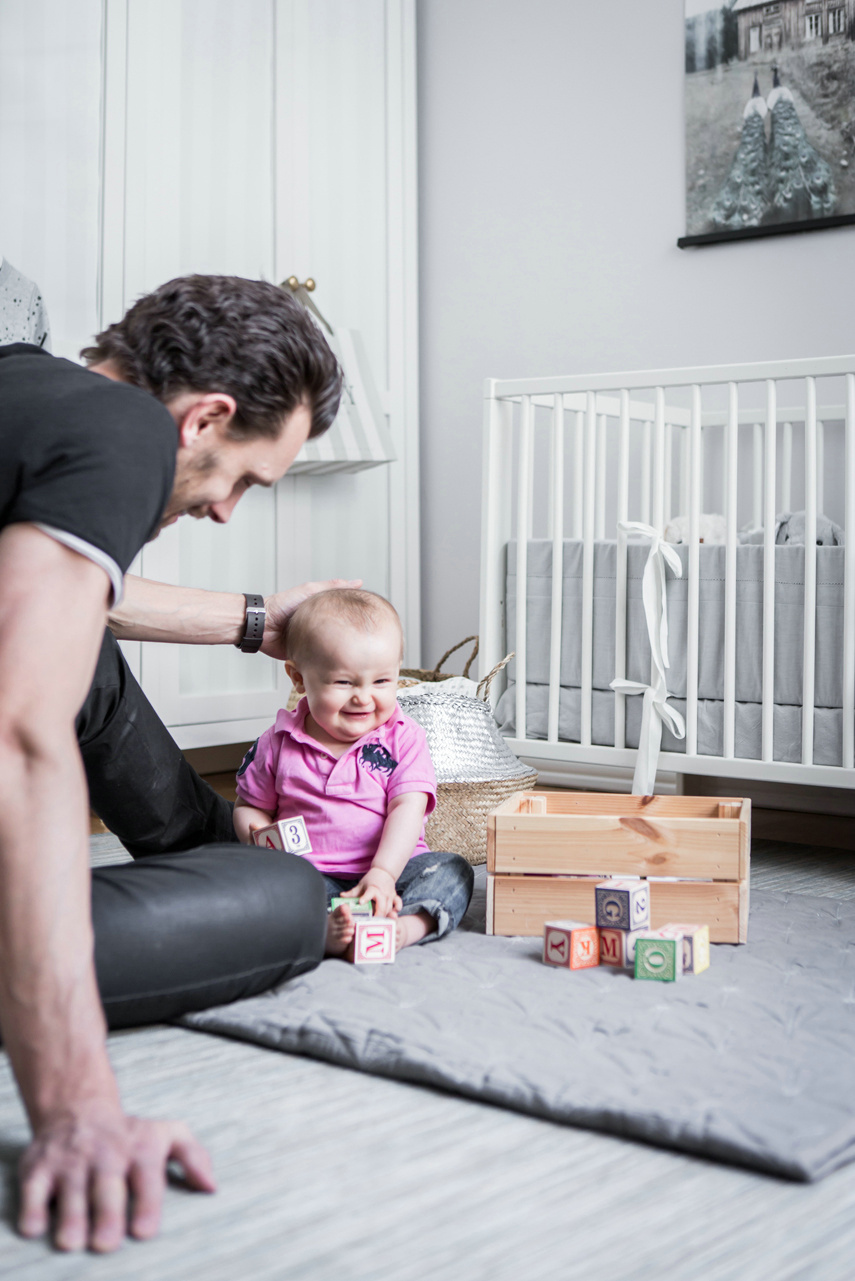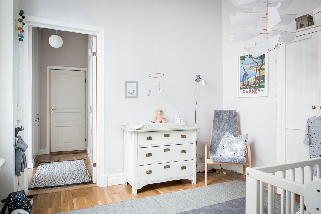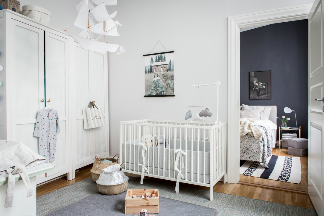 兒童房與主臥相連,這讓屋主更加便于照顧孩子,純凈的色彩下灰色調(diào)的融入增添了柔和與舒適的感受,手工編織的簍子,原木色的儲物筐,讓孩子的睡眠空間質(zhì)樸又自然,相比之下主臥深色調(diào)的背景墻面,則顯得更為靜謐優(yōu)雅,綠植、書籍,看似不經(jīng)意的點綴彰顯出隨性的生活氣息。