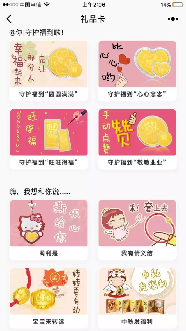 顧客可通過“我的周大福”小程序購買產(chǎn)品,周大福用走心設(shè)計(jì)的禮品紅包,短平快地表達(dá)用戶心意,更可通過照片和視頻附加贈(zèng)送留言,讓贈(zèng)送者的心意滿滿呈現(xiàn),隨后通過微信即時(shí)贈(zèng)送好友,開創(chuàng)微信聊天新方式。周大福特別推出小程序完成禮物的購買,通過群發(fā)禮品紅包,讓顧客體驗(yàn)社交互動(dòng)樂趣,不只是禮物,更加有溫度。