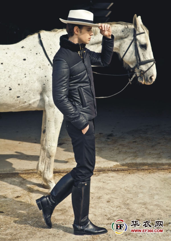 杰尼軒詩男裝2013秋冬經(jīng)典的馬術文化將男裝與男人的雄性以及戶外云動結合起來,在每一款男裝設計中,都不忘展現(xiàn)男人氣質(zhì)和魅力的流暢線條的加入。此款黑色拼接棉外套,穿在身上既不會顯得臃腫,同時也能結合長筒靴等單品搭配,共同完成男人的魅力穿著。
