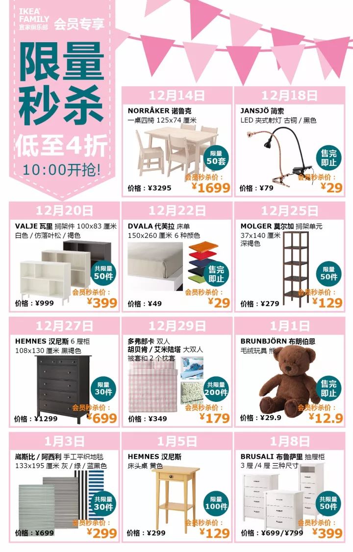 12月14日-1月8日,廣州宜家為宜家俱樂部會員準(zhǔn)備了十一款秒殺產(chǎn)品,快點收起下面的秒殺日歷,早上10點準(zhǔn)時來到宜家商場拼手速吧!掃二維碼加入會員,免費獲得秒殺資格。產(chǎn)品數(shù)量有限,售完即止!