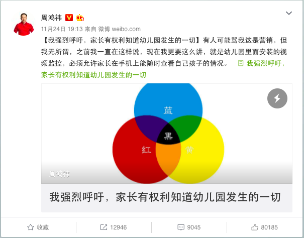 實(shí)際上,包括攜程親子園在內(nèi)的多起“虐童”事件之所以發(fā)生,主要疏漏即在監(jiān)控這一環(huán)節(jié)。監(jiān)控死角多、監(jiān)控力度弱永遠(yuǎn)為虐待行為提供掩護(hù)。近日奇虎360董事長周鴻祎曾在微博發(fā)文,表示安裝360智能攝像機(jī)能夠讓家長隨時(shí)在手機(jī)上查看自己孩子的情況,而對于幼兒園,360一直實(shí)行免費(fèi)送、免費(fèi)安裝。