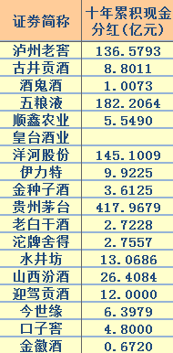 眾所周知,白酒股現(xiàn)金分紅力度位于A股前列,十年時間白酒股整體累計分紅近900億元,其中貴州茅臺十年共現(xiàn)金分紅417.97億元,五糧液共現(xiàn)金分紅182.2億元,瀘州老窖共現(xiàn)金分紅136.58億元。