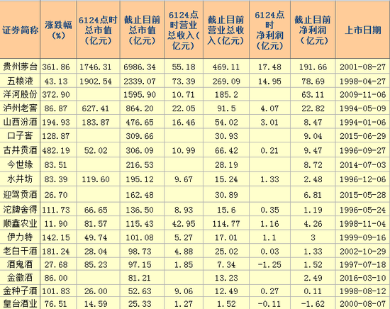 以下為白酒股“十年”對比數(shù)據(jù)(按目前總市值排行):