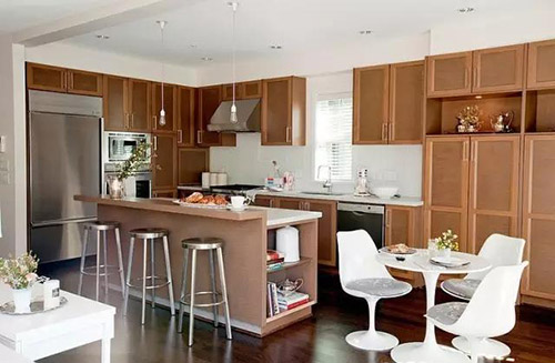 \u00A0\u00A0\u00A0\u00A0長方形的原木餐桌、具有設(shè)計感的椅子和整潔的餐具一同裝點著客廳一角。
