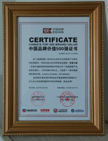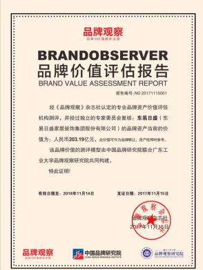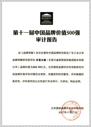 2017年12月18日,2017年中國品牌價(jià)值500強(qiáng)榜單揭曉,東易日盛2017年品牌價(jià)值203.19億,較2016年增長54.14%;500強(qiáng)榜單位列第204位,排名上升73位!