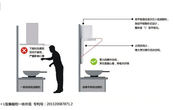 很多愛好廚藝的人在下廚時總感覺空間不夠用,從而嚴(yán)重影響了烹飪的展示以及烹飪的心情。和一般傳統(tǒng)吸油煙機(jī)相比,前鋒極速?雙吸平板吸油煙機(jī),整體呈倒“L”形,由兩部分組成,第一部分是緊貼安裝墻壁的大型超薄側(cè)面集煙腔,第二部分是與視線位置不相上下的主體裝置,形似T型煙機(jī),卻沒有T型煙機(jī)撞頭的煩惱!可與櫥柜完美契合,讓煙機(jī)隱身!這樣也更易于廚房搭配,滿足多樣家裝風(fēng)格。前鋒此次將平板理念首次引入吸油煙機(jī),獨創(chuàng)平板隱形設(shè)計,占用廚房空間小,大大增加了烹飪操作的活動空間,18般廚藝,如臂指使。烹飪美食好心情,下廚更隨心所欲。